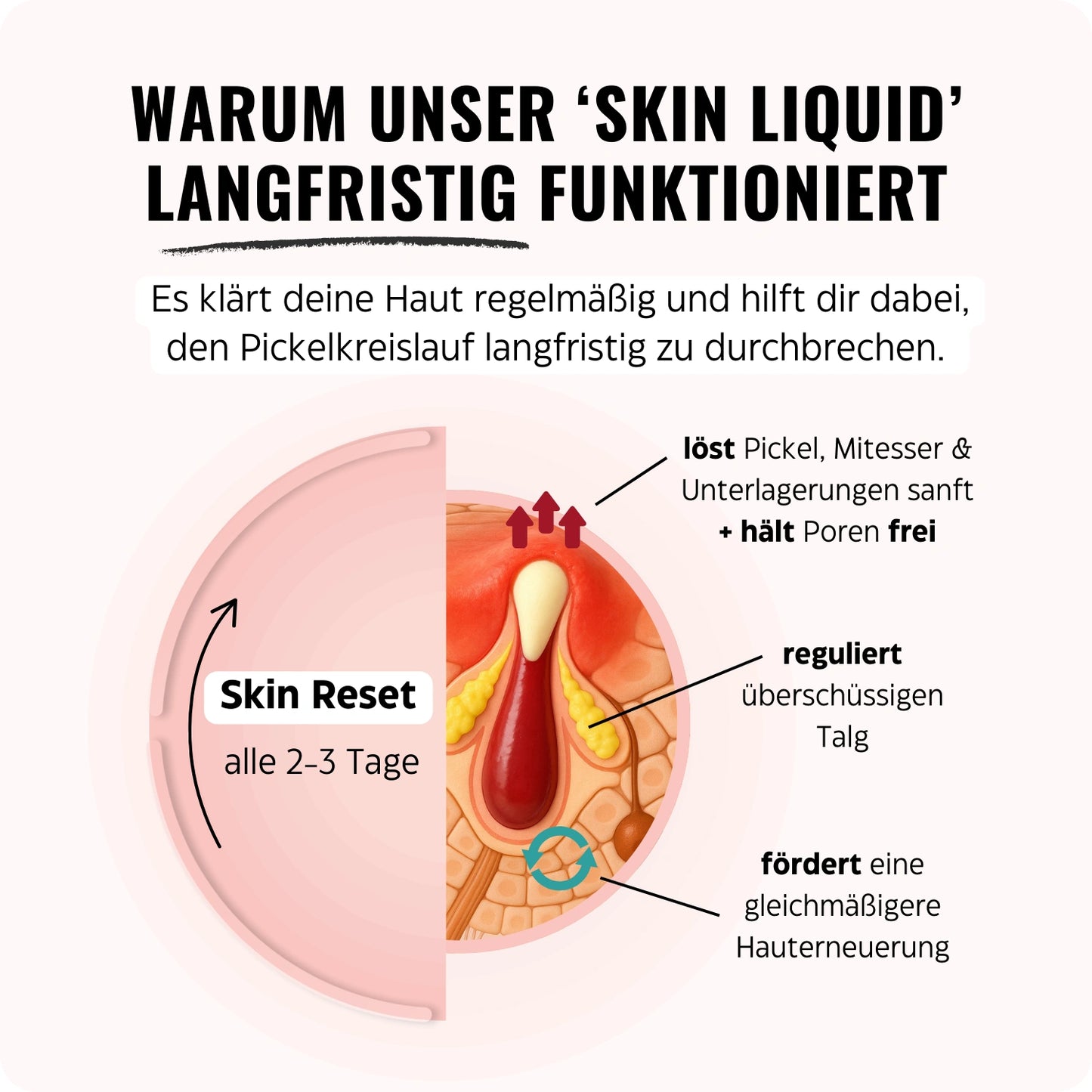 Statt deine Haut mit aggressiven Anti-Pickel-Mitteln zu reizen, klärt das Skin Liquid sanft an der Wurzel und unterstützt die natürliche Hauterneuerung. Der Fokus liegt auf Hautbalance – und darauf, den endlosen Pickel-Kreislauf endlich zu durchbrechen.