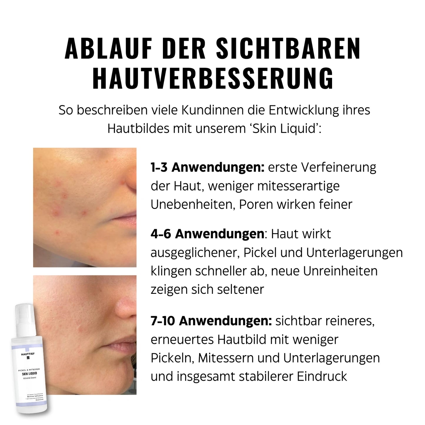 4–6 Anwendungen: Haut wirkt ausgeglichener, Pickel und Unterlagerungen klingen schneller ab, neue Unreinheiten zeigen sich seltener