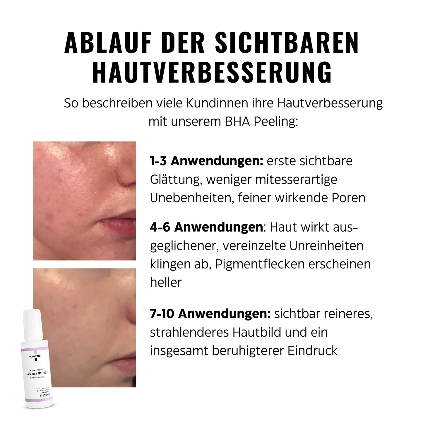 So beschreiben viele Kundinnen ihre Hautverbesserung mit unserem BHA Peeling: